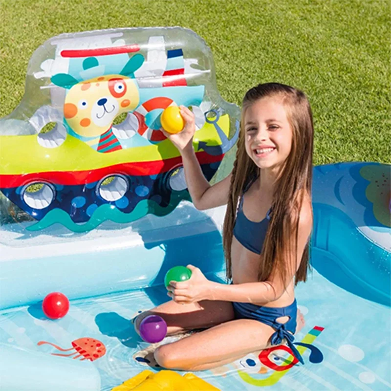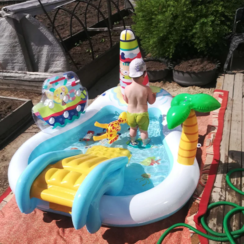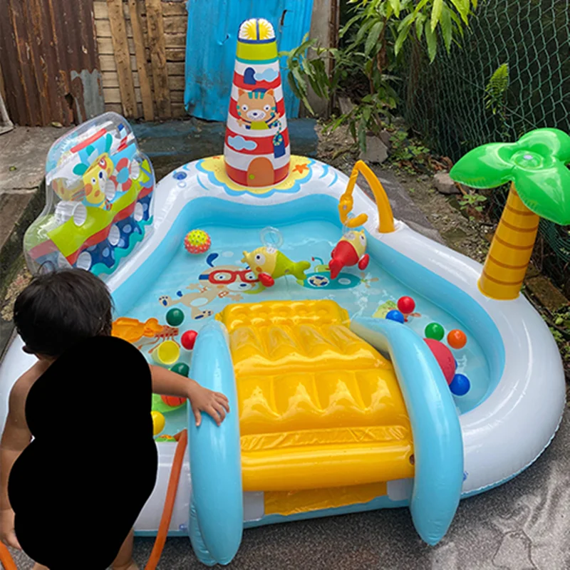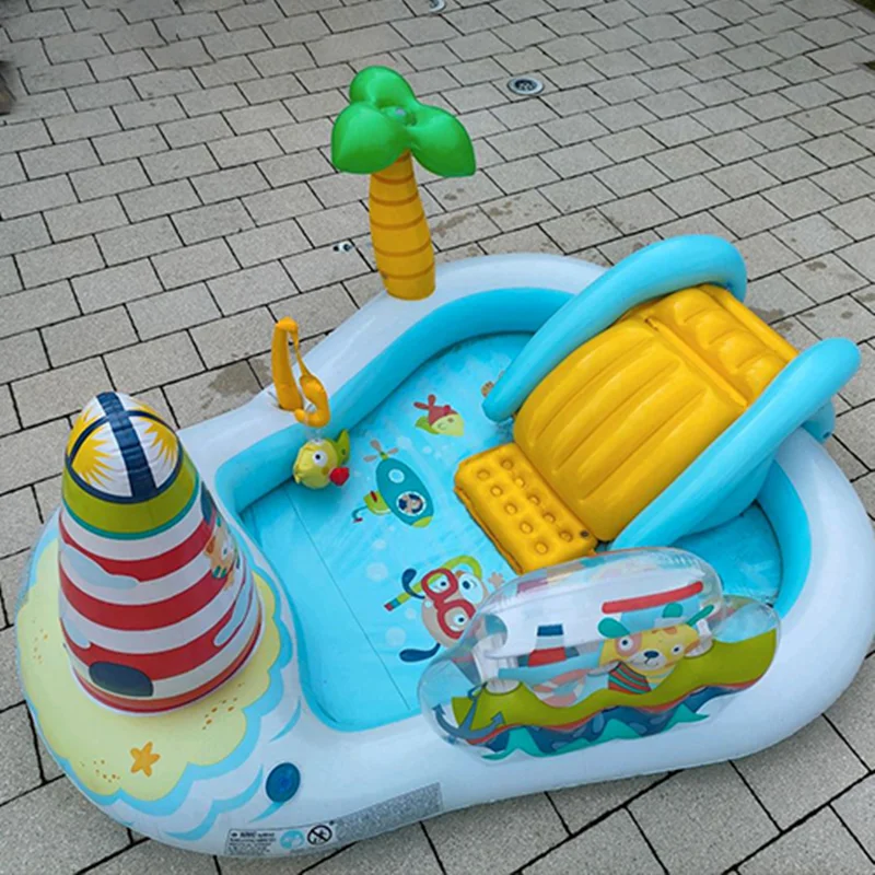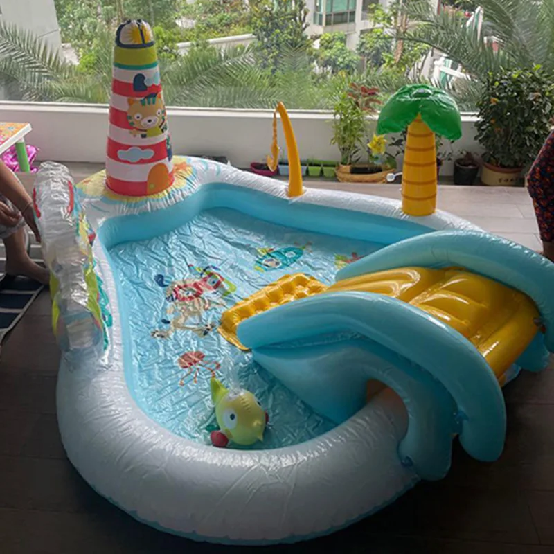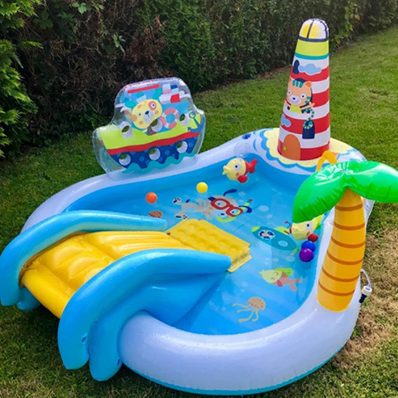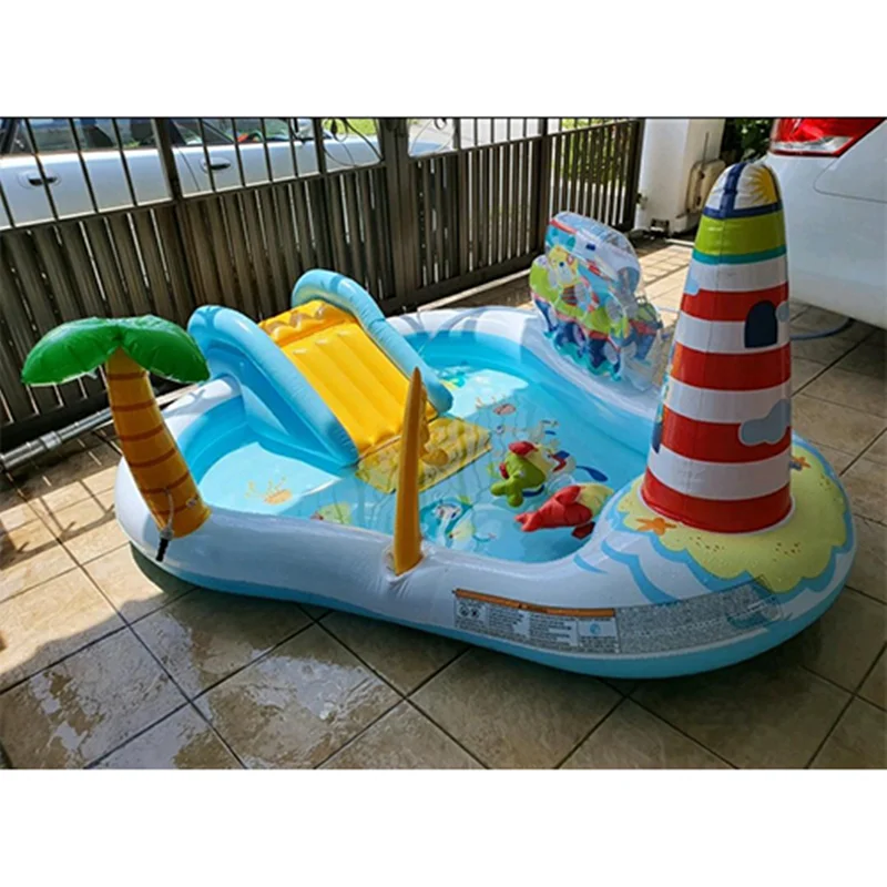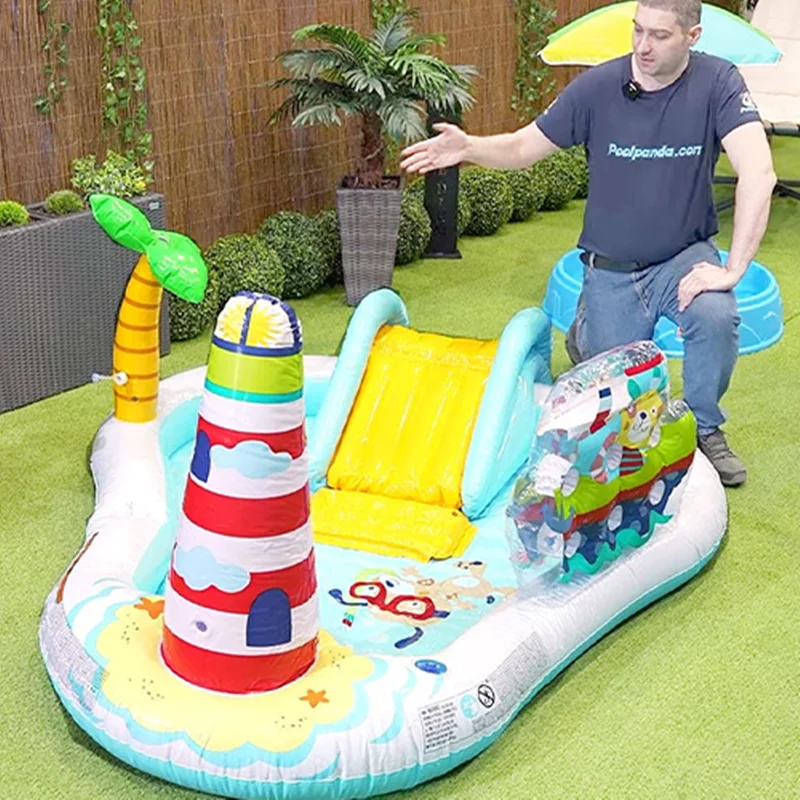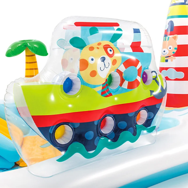 بر روی دیواره استخر بادی یک سرسره بادی متصل به بدنه نصب شده است که کودکان به استفاده از آن علاقه زیادی نشان داده و فضایی مناسب برای بازی می باشد. این سرسره بادی به صورت مواج بوده که کودک بتواند به راحتی از روی آن سُر بخورد. هم چنین این محصول دارای فانوس دریایی نیز می باشد که به صورت بادی است. در داخل این استخر بادی ماهی های بادی نیز وجود دارد. یک درخت بادی نیز بر روی بدنه قرار دارد که آبپاش بوده و در زمان بازی کودکان، آب را پمپاژ می کند. این محصول با برخورداری از اسباب بازی های بادی هیجان انگیز، فضایی مانند پارک های آبی را برای کودکان تداعی می کند و به ایجاد فضایی بی نظیر کمک خواهد کرد. کودک از بازی در داخل این محصول خسته نشده و برای بازی های گروهی کودکان نیز مناسب است.