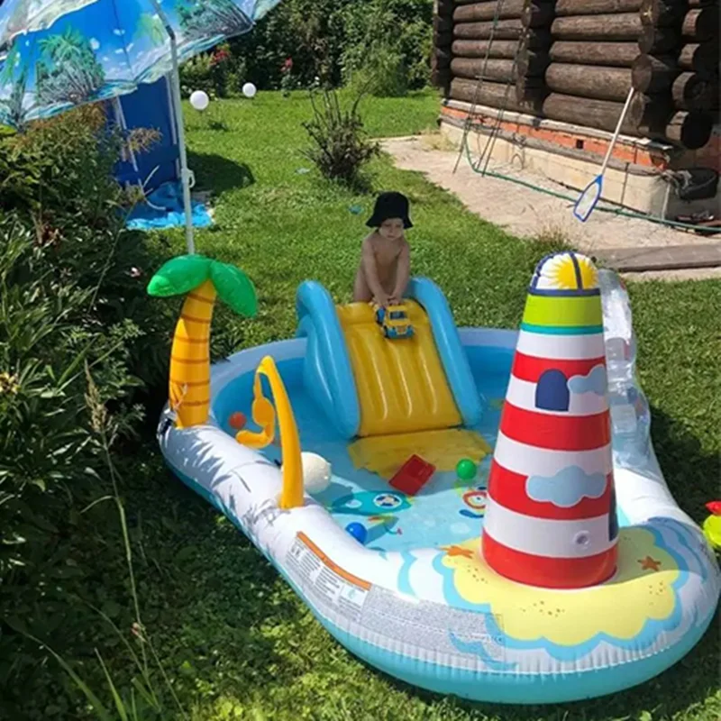 استخر بادی سرسره دار اینتکس طرح فانوس دریایی محصولی جذاب و مدرن است که برای تفریحات آبی کودکان طراحی شده و دارای ظاهری شاد و فانتزی می باشد. این استخر بادی دیواره ای کوتاه دارد که ایمنی کودک در زمان بازی حفظ می شود و کودکان بالاتری از سه سال می توانند به راحتی از آن استفاده نمایند. یکی از ویژگی های این استخر بادی برخورداری اسباب بازی های بادی متصل به بدنه است که فضایی هیجان انگیز را ایجاد می کند. طراحی این استخر بادی به صورت فانوس دریایی بوده که بسیار زیبا می باشد.