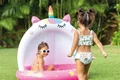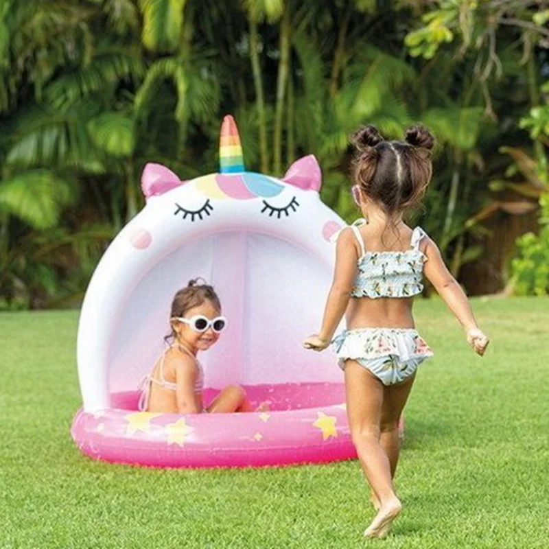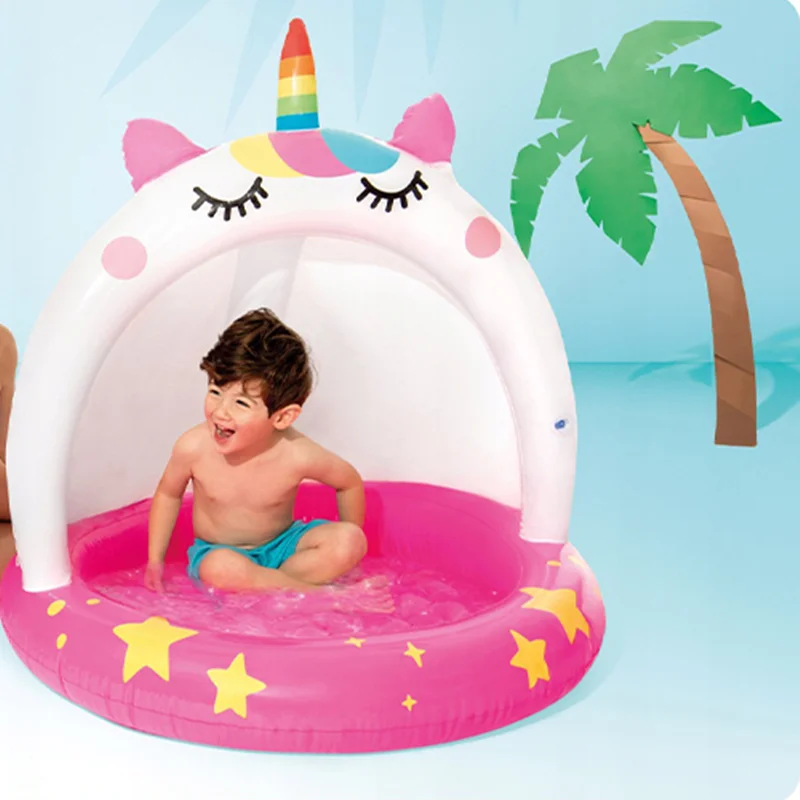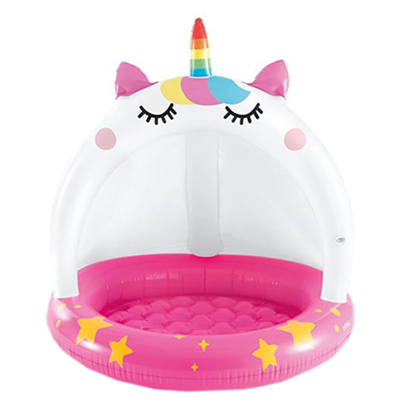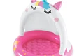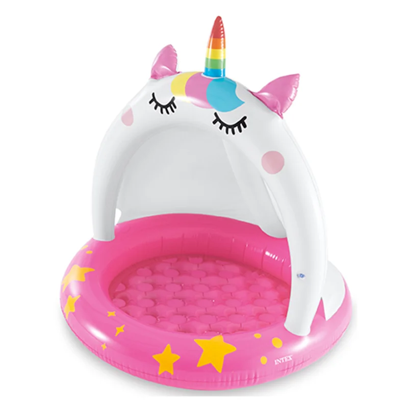 استخر بادی کودک اینتکس طرح سایبان دار یونیکورن بی شک بهترین و جذاب ترین استخر بادی برای کودکان بالای دو سال می باشد. این استخر بادی به شکل جذاب یونیکورن تولید شده است و دارای ابعادی متوسط بوده که فضای کافی را برای بازی و استفاده کودک در اختیار او قرار می دهد. این محصول دارای دیواره ای به صورت یک تکه است که پهن بوده و انعطاف بالایی دارد. این دیواره به دلیل کوتاه بودن، ایمنی کودک را حفظ کرده و از افتادن کودک در داخل آب جلوگیری می کند.