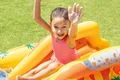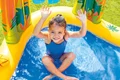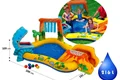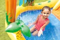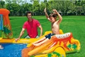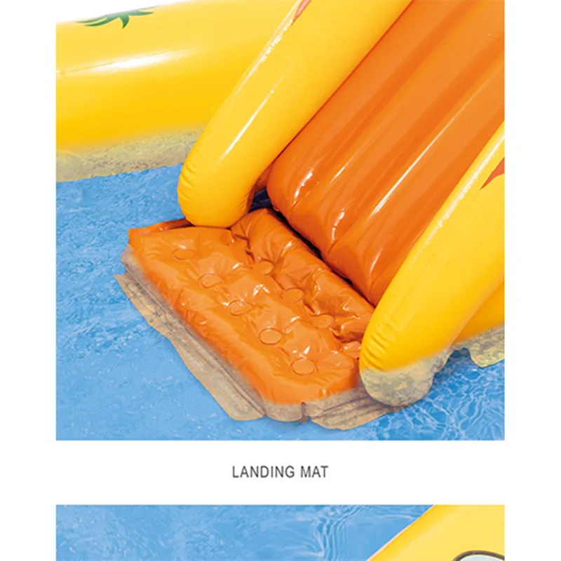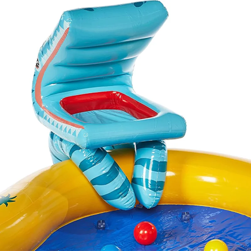 بدنه این استخر بادی به صورت جالبی طراحی شده است و دارای فرم خاصی می باشد. در این استخر بادی دو عدد آبپاش تعبیه شده است که فضایی هیجان انگیز را برای کودک ایجاد می کند. هم چنین وجود اسباب بازی های بادی در اطراف استخر نیز زیبایی محصول را دوچندان می کند. یکی از قابلیت های این استخر بادی برخورداری از سرسره بادی در کنار استخر است. این سرسره به هیجان بازی های کودکان کمک بیش تری می کند و فضایی لذت بخش برای بازی را فراهم خواهد کرد. برای راه اندازی این محصول لازم است تا زیرسازی مناسب را انجام دهید. شما باید فضایی انتخاب کنید که مسطح و هموار باشد و بدون اشیای تیز باشد. برای این کار می توانید از انواع زیرانداز استخر نیز استفاده کنید. سپس استخر بادی را از بسته بندی خارج کرده و توسط یک پمپ باد اینتکس، راه اندازی نمایید.