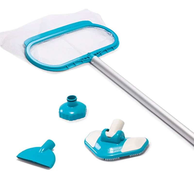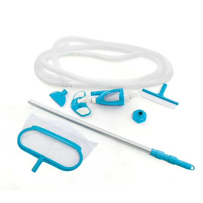 ست نظافت دستی حرفه ای استخر پیش ساخته یکی از مهم ترین ابزار هایی است که دارندگان استخر پیش ساخته و ایزی ست می بایست نسبت به داشتن آن اقدام کنند تا در صورت نیاز به تمیز کردن بخش داخلی استخر خود از این محصول بهره برداری نمایند. ست نظافت مد نظر به صورت دستی کار می کند. به طوری که با توجه به مشکل به وجود آمده می توان سری مناسب را به دسته تلسکوپی محصول متصل کرد و موقعیت را برای برطرف کردن آلودگی مناسب کرد. سری های موجود در این مجموعه شامل فرچه برای تمیز کردن سطح داخلی و توری برای خروج زباله از سطح آب می باشد همچنین دارای جارو لجن کش می باشد که با اتصال به پمپ تصفیه آب می تواند تمامی موارد موجود در آب را از بدنه خارج کرده و به بیرون هدایت کند. چرا که این سری دارای شلنگ تخلیه نیز می باشد و به راحتی آلودگی را به بیرون هدایت می کند.